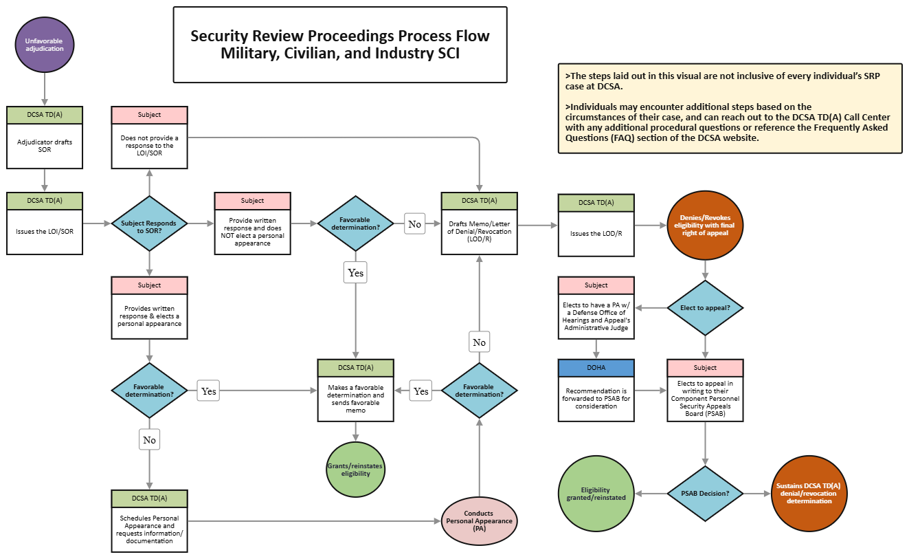 Civilian personnel, military members, and contractors (requiring SCI eligibility) are afforded the opportunity to appear in a virtual personal appearance (PA) with the Defense Counterintelligence and Security Agency (DCSA) Trust Decision (Adjudications) (TD(A)). As part of the USD (I&S) due process reform initiative, the new Security Review Proceeding (SRP), affords individuals a chance to provide additional mitigating information and documentation directly correlating to the security concern(s) listed in the Statement of Reasons (SOR), prior to issuance of a final determination.