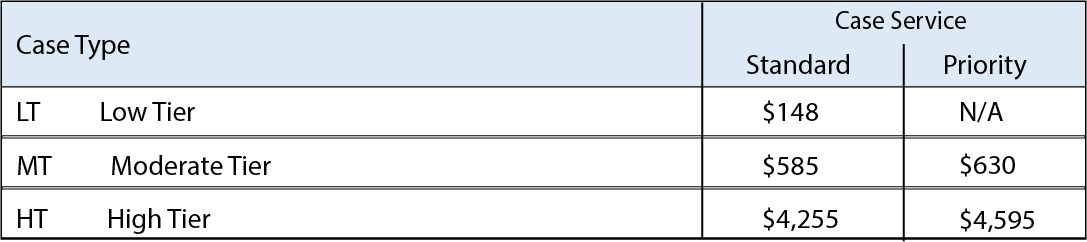 Note: For case types T2s/T2Rs, T4/T4R and T5/T5R, priority services (Case Service Code “A”) is available at a higher base price, which will prioritize the processing of your request ahead of standard service cases. All other case types are only available in standard service.