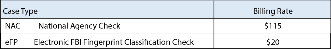 DCSA’s investigative mission is funded through fee-for-service fully reimbursable billing rates. Case billing rates are applied according to the case type and service type ordered, the date the complete investigation request is received by DCSA, and the effective published billing rates for that fiscal year. Additional and subsequent fees and adjustments may be applied depending on any optional extra coverage requested, required expanded coverage to include the Triggered Enhanced Subject Interview (TESI), International Coverage, case upgrades or downgrades, and case discontinue requests.